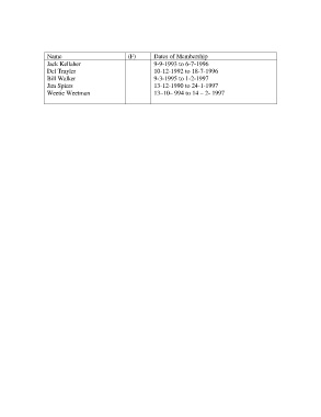 Name (F) Dates of Membership Jack Kellaher 9-9-1993 to 6-7-1996 Del Trayler 10-12-1992 to 18-7-1996 Bill Walker 9-3-1995 to 1-2-1997 Jim Spiers 13-12-1990 to 24-1-1997 Weetie Weetman 13–10– 994 to 14 – 2- 1997